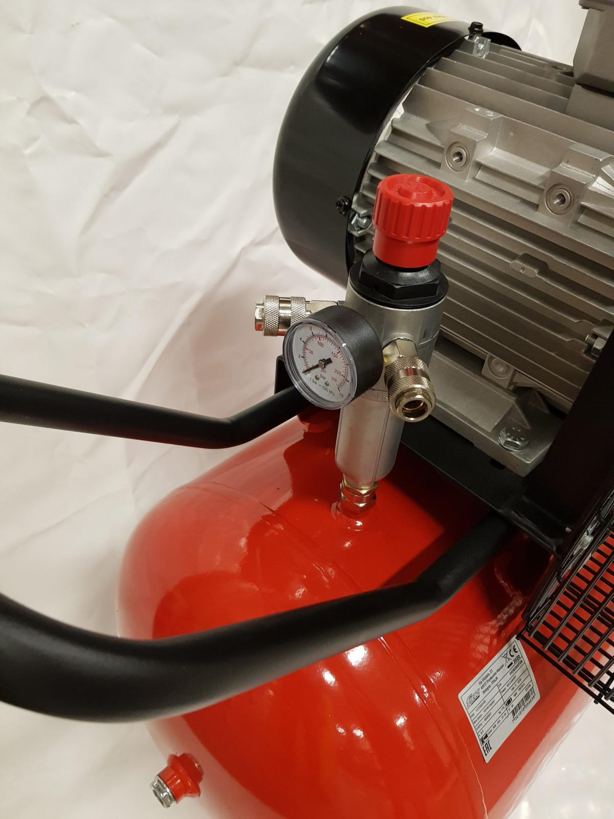2-cylindrig, remdriven kompressor, där remskivan på kompressordelen har fläktvingar för bra kylning. Lågt varvtal. Kompressorn är utrustad med tryckströmbrytare, manometer, säkerhetsventil, reduceringsventil, snabbkoppling och hjul. 3-fas handske ingår ej.